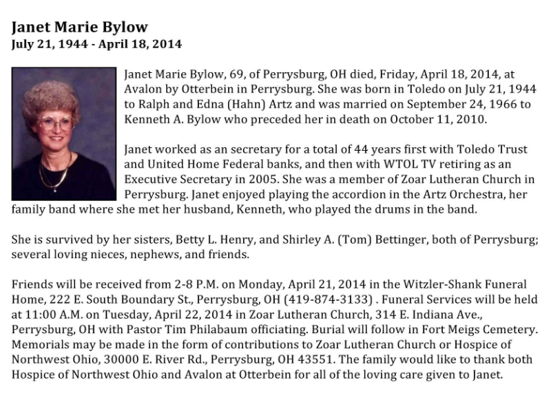 Bylow, Janet - Remembrance Card, Witzler Shank Funeral Home, Perrysburg, OH