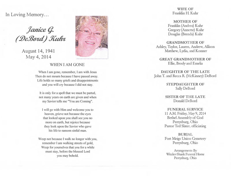 Kuhr, Janice G Remembrance Card, Witzler Shank Funeral Home