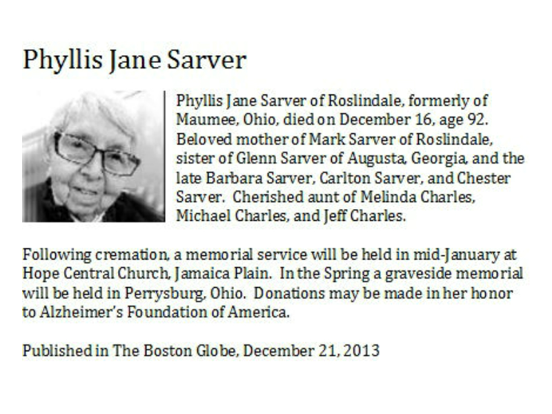 Sarver, Phyllis J, Boston Globe; December 21, 2013