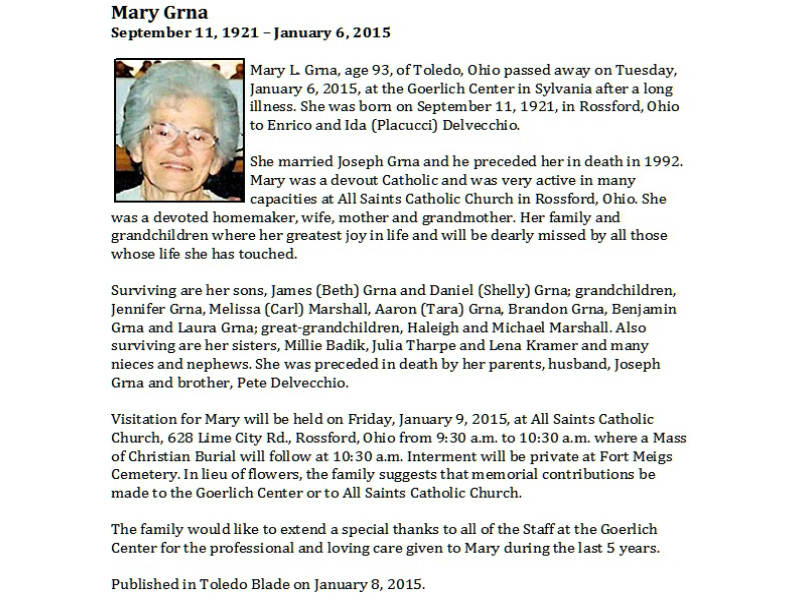 Grna, Mary, Sujkowski Funeral Home of Rossford Published in Toledo Blade; 01/08/2015