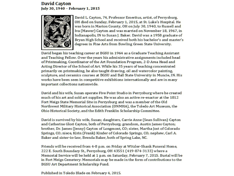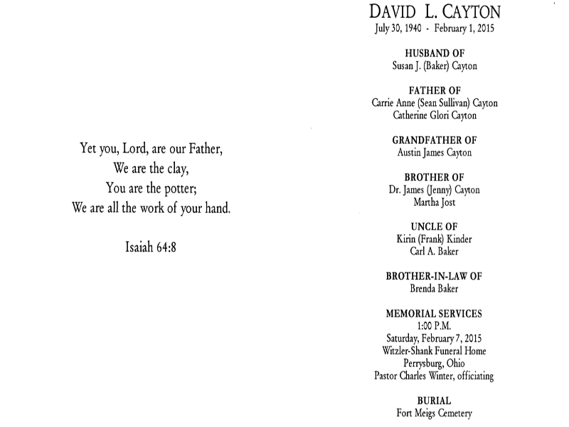 Cayton, David, Witzler Shank Funeral Home, Perrysburg, OH Published in Toledo Blade; 02/04/2015