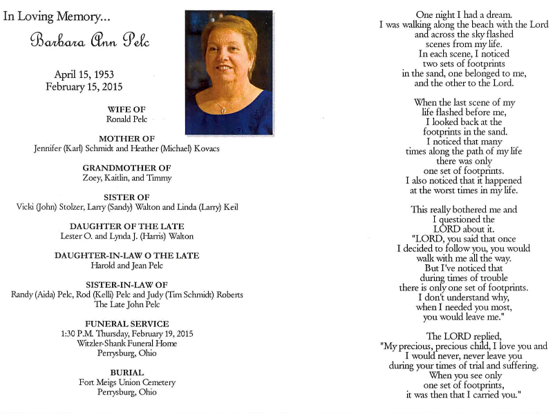 Pelc, Barbara - Remembrance Card, Witzler Shank Funeral Home, Perrysburg, OH