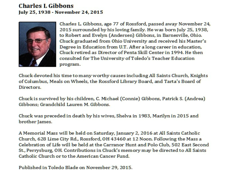 Gibbons, Charles, Sujkowski Funeral Home, Rossford, OH Published in Toledo Blade; 11/29/2015