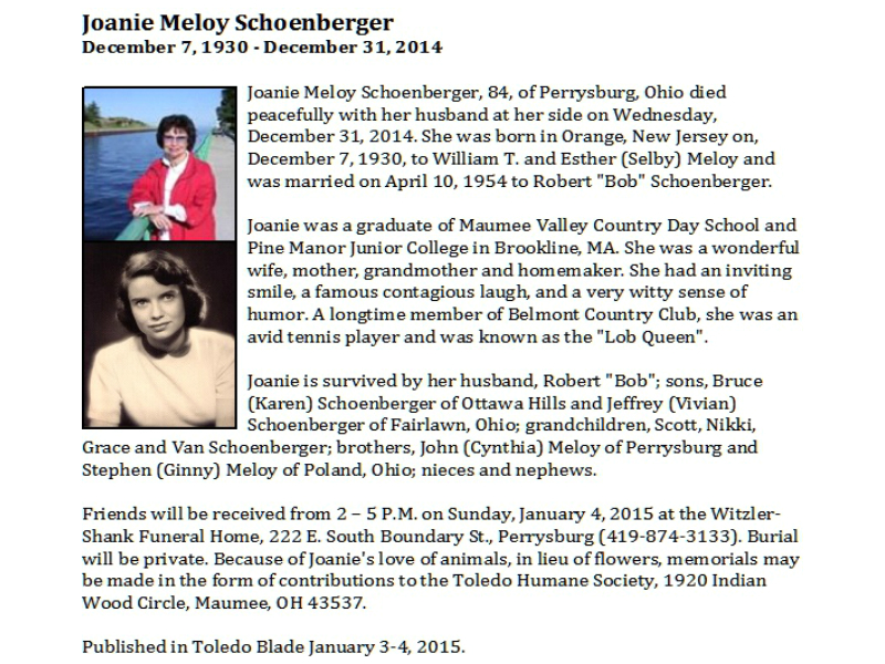 Schoenberger, Joan, Witzler Shank Funeral Home, Perrysburg, OH Published in Toledo Blade; 1/3-1/4/2015