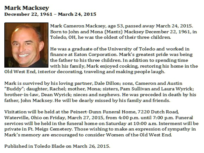 Macksey, Mark, Peinert-Dunn Funeral Home, Waterville, OH Published in Toledo Blade; 03/26/2015