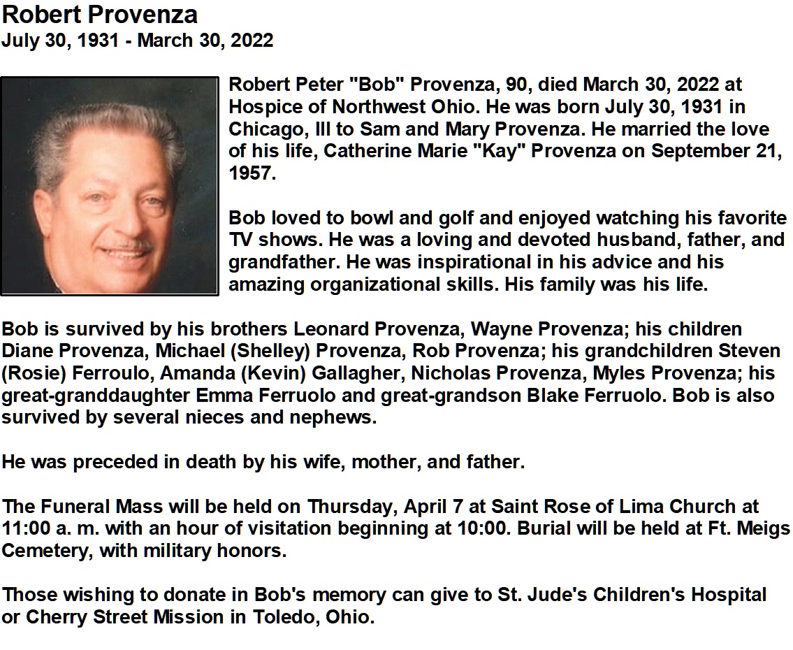 Provenza, Robert P - Obituary, Coyle Funeral Home, Toledo, OH