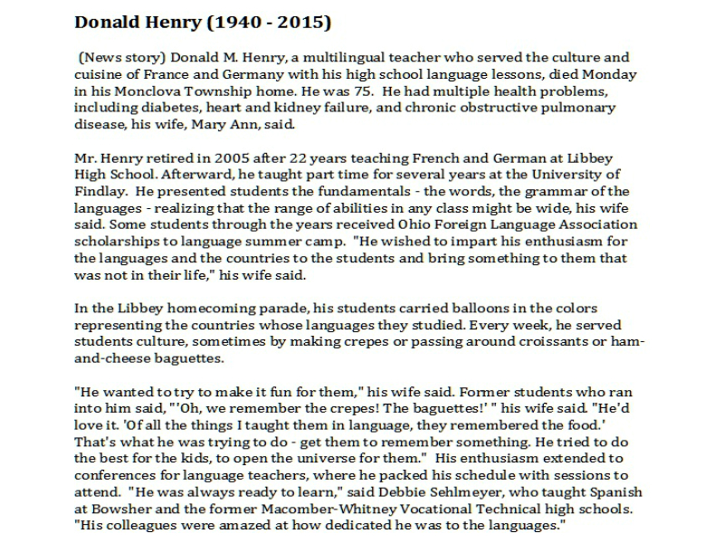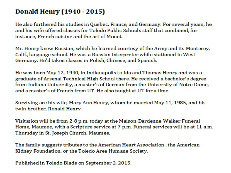 Henry, Donald - Obituary pg 2, Maison Dardenne Walker Funeral Home, Maumee, OH Published in Toledo Blade; 09/03/2015