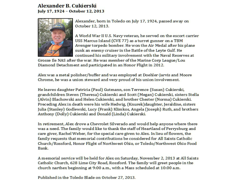 Cukierski, Alexander, Newcomer Funeral Home, Toledo, Ohio Published in Toledo Blade; 10/27/2013