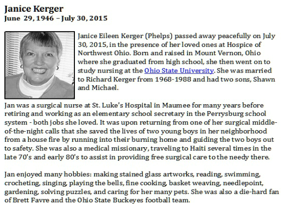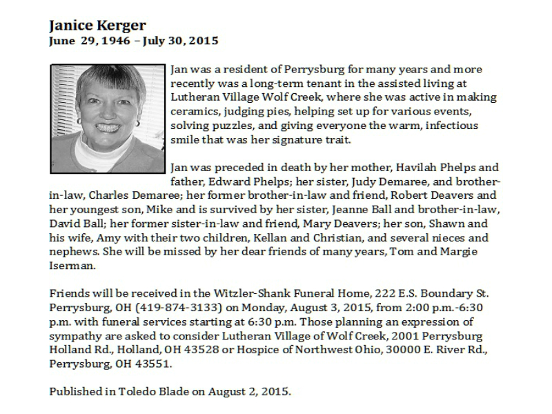 Kerger, Janice - Obituary pg 1, Witzler Shank Funeral Home, Perrysburg, OH Published in Toledo Blade; 08/02/2015