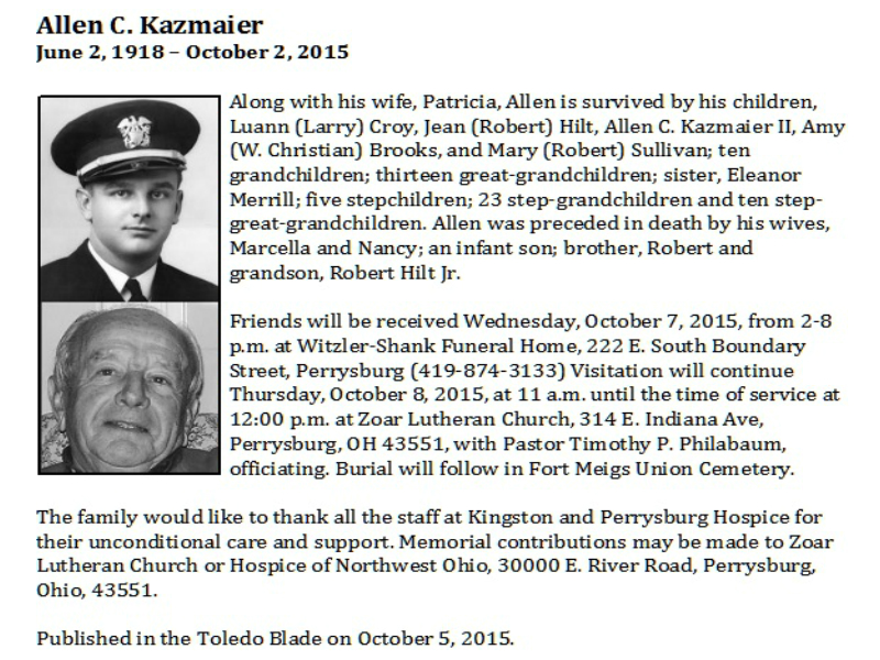 Kazmaier, Allen - Obituary pg 1, Witzler Shank Funeral Home, Perrysburg, OH Published in Toledo Blade; 10/05/2015