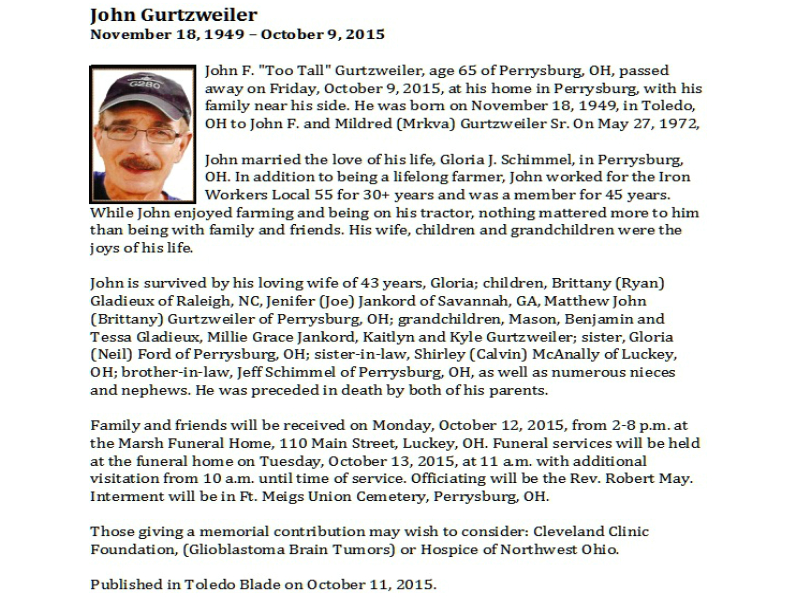 Gurtzweiler, John, Marsh Funeral Home, Luckey, OH Published in Toledo Blade; 10/11/2015