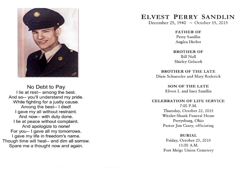 Sandlin, Elvest - Obituary, Witzler Shank Funeral Home, Perrysburg, OH Published in Toledo Blade; 10/18/2015