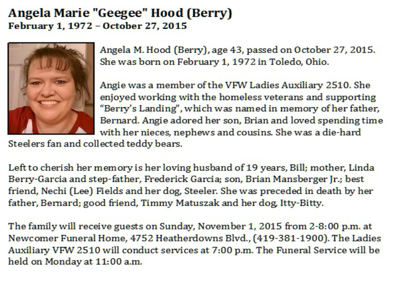 Hood, Angela, Newcomer Funeral Home, Toledo, Ohio Published in Toledo Blade; 10/31/2015