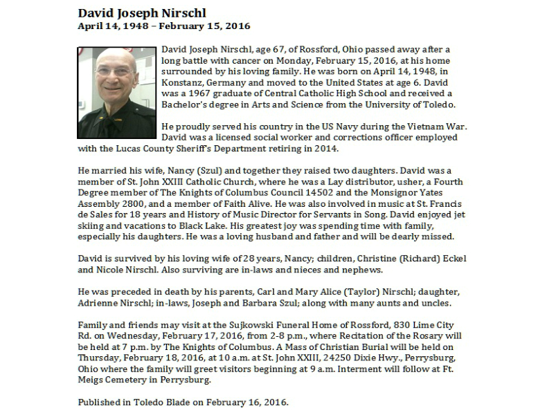 Nirschl, David, Sujkowski Funeral Home, Rossford, OH Published in Toledo Blade; 02/16/2016