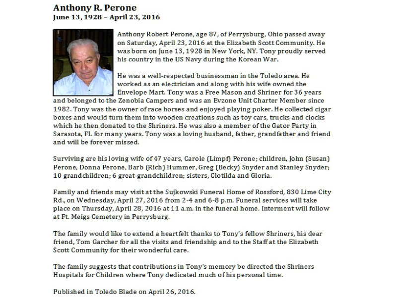Perone, Anthony, Sujkowski Funeral Home, Rossford, OH Published in Toledo Blade; 04/26/2016
