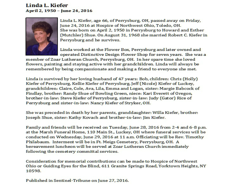 Kiefer, Linda, Marsh Funeral Home, Luckey, OH Published in Sentinel-Tribune; 06/27/2016