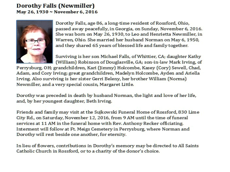 Falls, Dorothy, Sujkowski Funeral Home, Rossford, OH