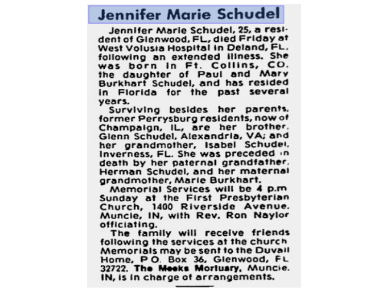 Schudel, Jennifer, The Meeks Mortuary, Muncie, IN Published in Toledo Blade; 09/20/1995