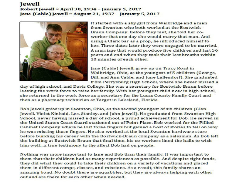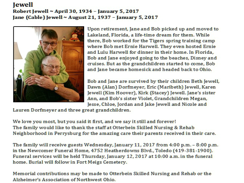 Jewell, Robert - Obituary pg 1, Newcomer Funeral Home, Toledo, OH Published in Toledo Blade; 01/09/2017