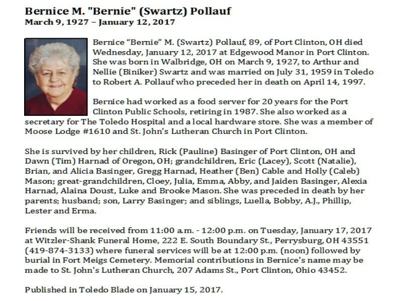 Pollauf, Bernice - Obituary, Witzler Shank Funeral Home