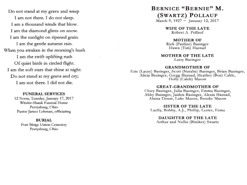 Pollauf, Bernice - Remembrance Card, Witzler Shank Funeral Home, Perrysburg, OH
