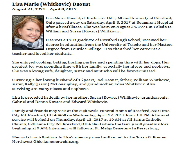Daoust, Lisa, Sujkowski Funeral Home, Rossford, OH