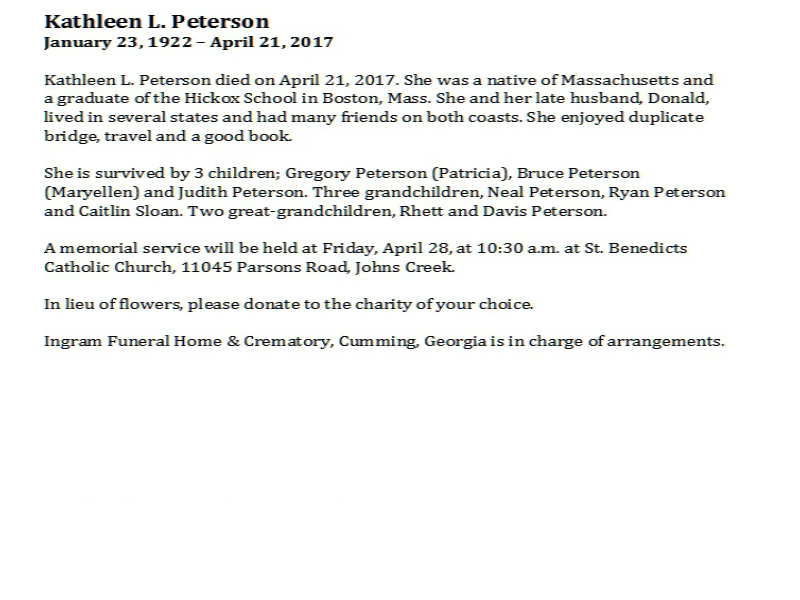 Peterson, Kathleen, Ingram Funeral Home, Cumming, GA