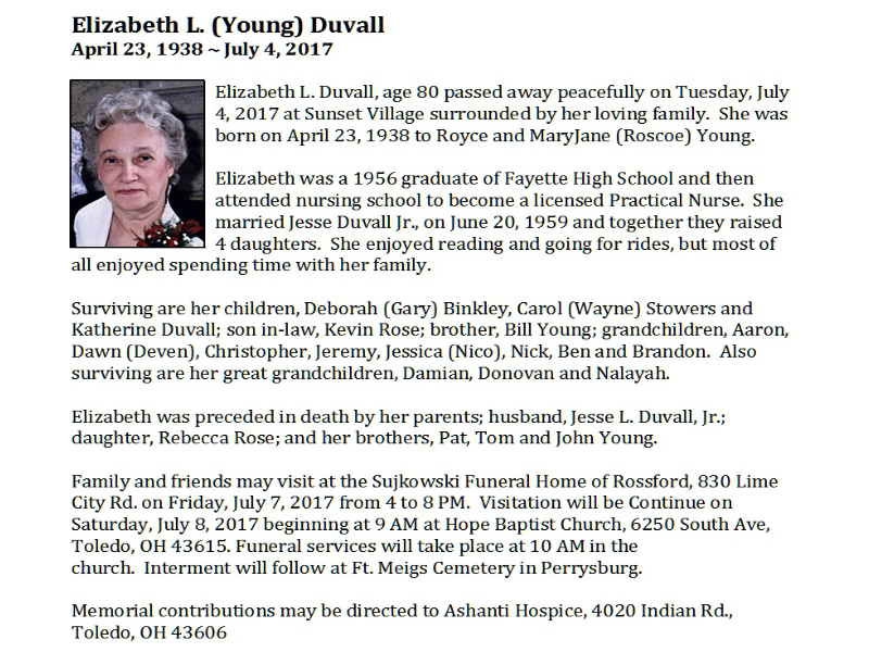 Duvall, Elizabeth, Sujkowski Funeral Home, Rossford, OH