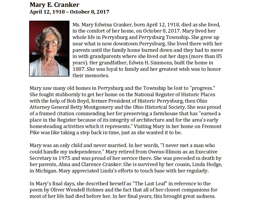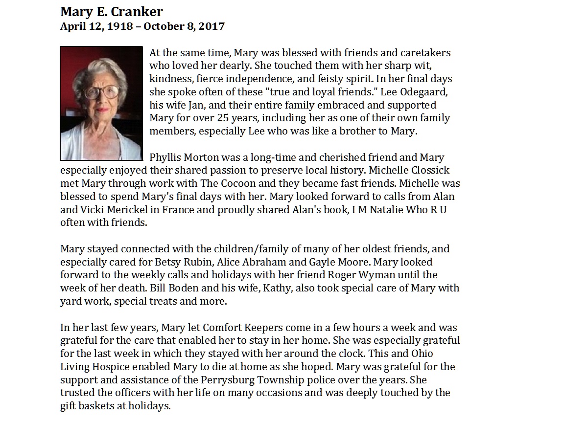 Cranker, Mary - Obituary pg 1, Witzler Shank Funeral Home, Perrysburg, OH