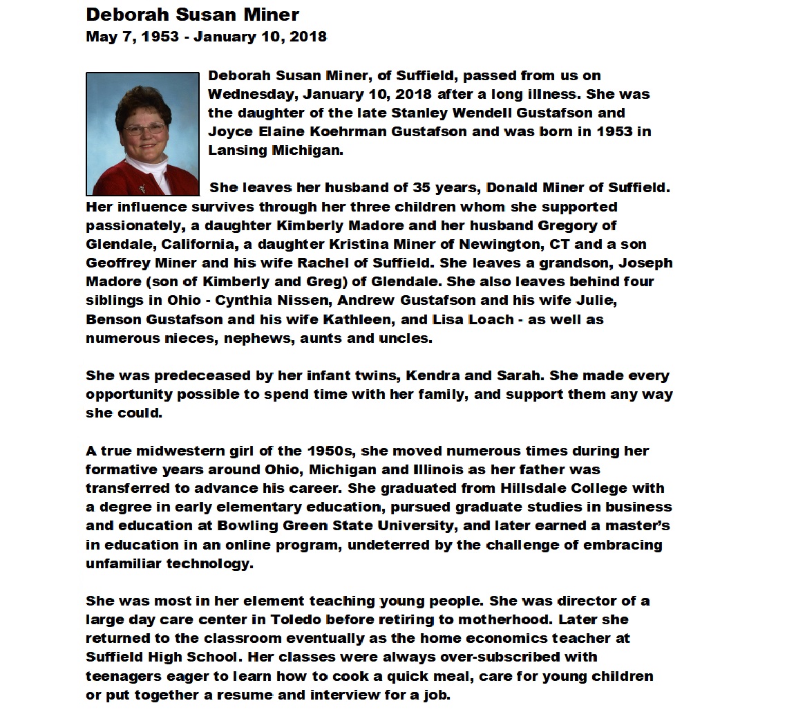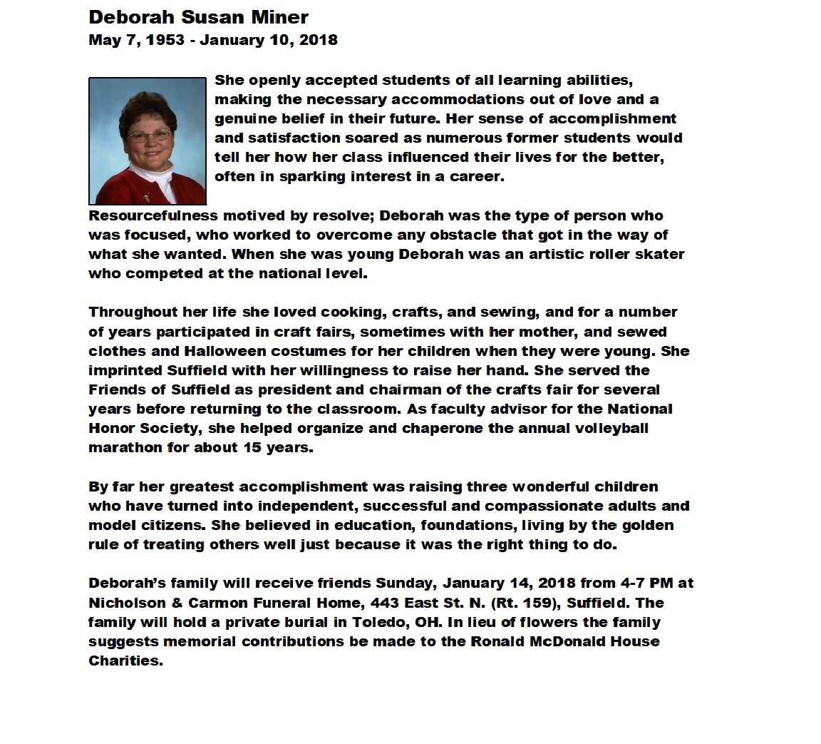 Miner, Deborah - Obituary pg 1, Nicholson Carmon Funeral Home, Suffield, CT