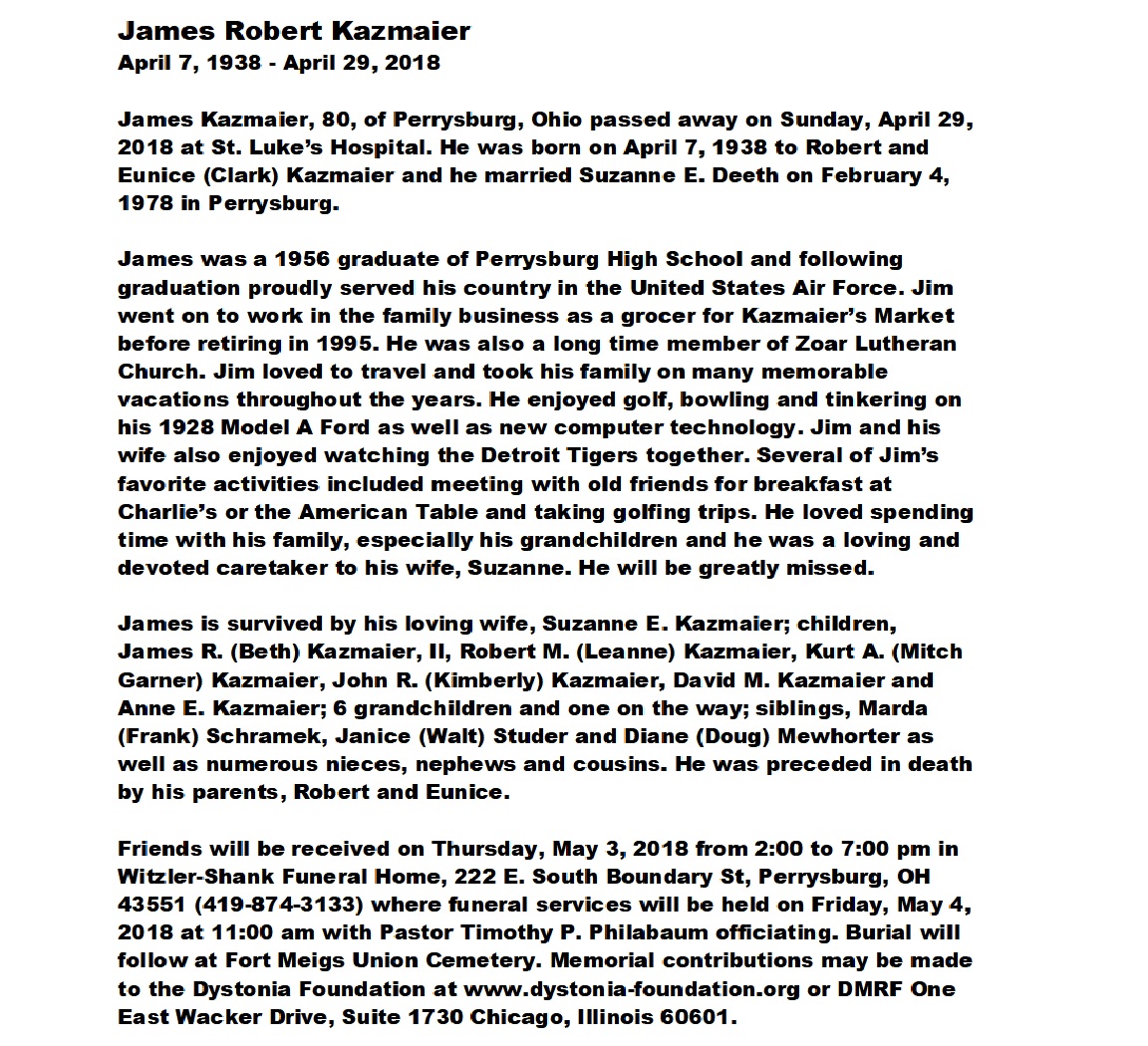Kazmaier, James R, Witzler Shank Funeral Home, Perrysburg, OH