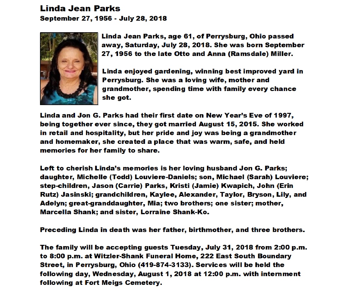 Parks, Linda - Obituary, Witzler Shank Funeral Home, Perrysburg, OH