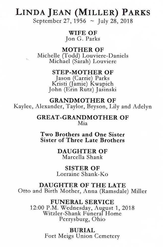 Parks, Linda - Remembrance Card, Witzler Shank Funeral Home, Perrysburg, OH