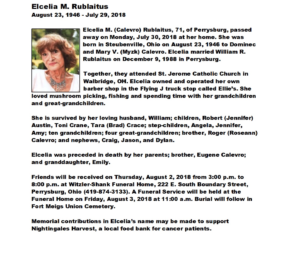 Rublaitus, Elcelia - Obituary, Witzler Shank Funeral Home, Perrysburg, OH