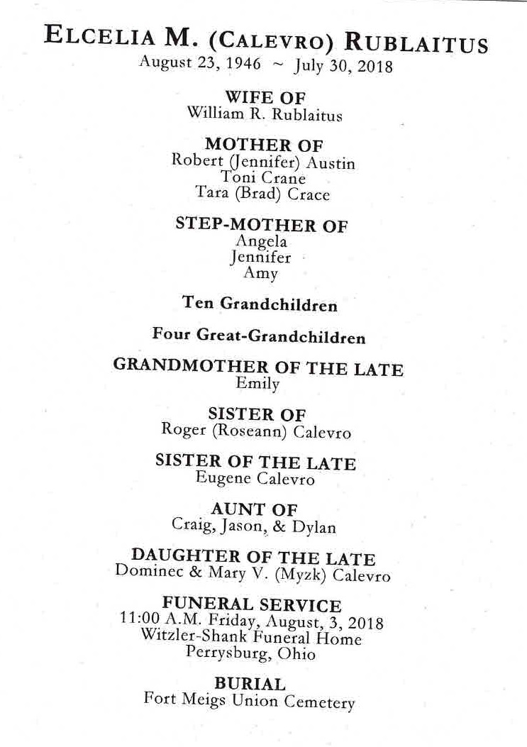 Rublaitus, Elcelia - Remembrance Card, Witzler Shank Funeral Home, Perrysburg, OH