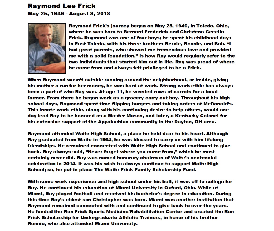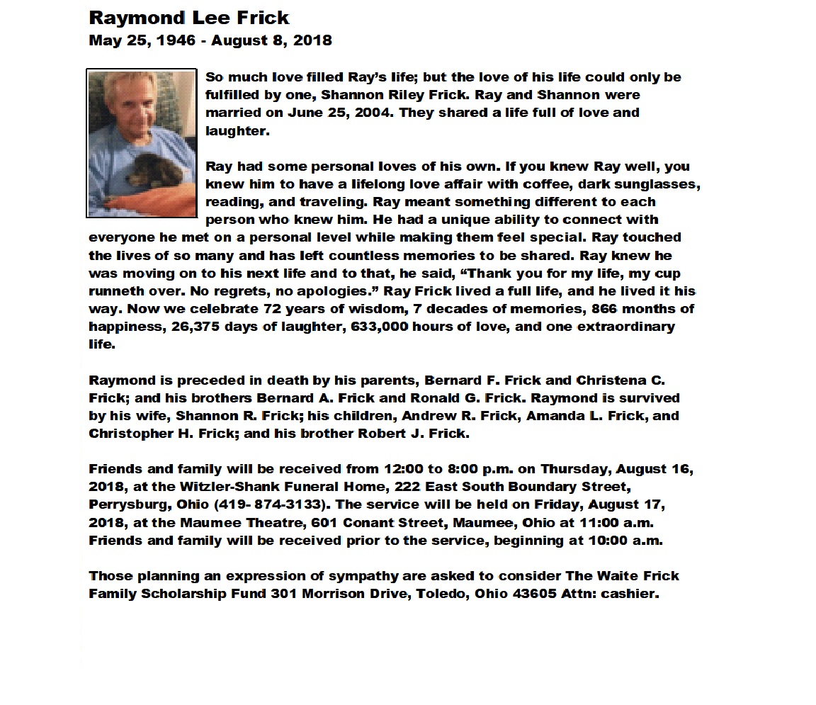 Frick, Raymond - Obituary pg 1, Witzler Shank Funeral Home, Perrysburg, OH