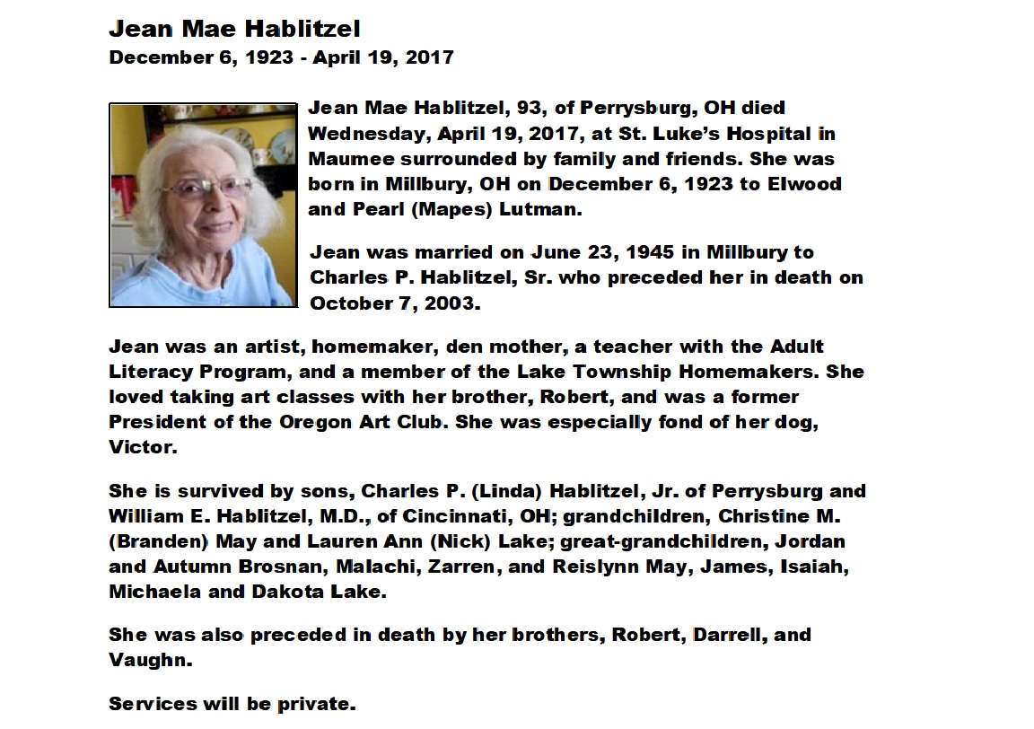 Hablitzel, Jean M, Witzler Shank Funeral Home, Perrysburg, OH