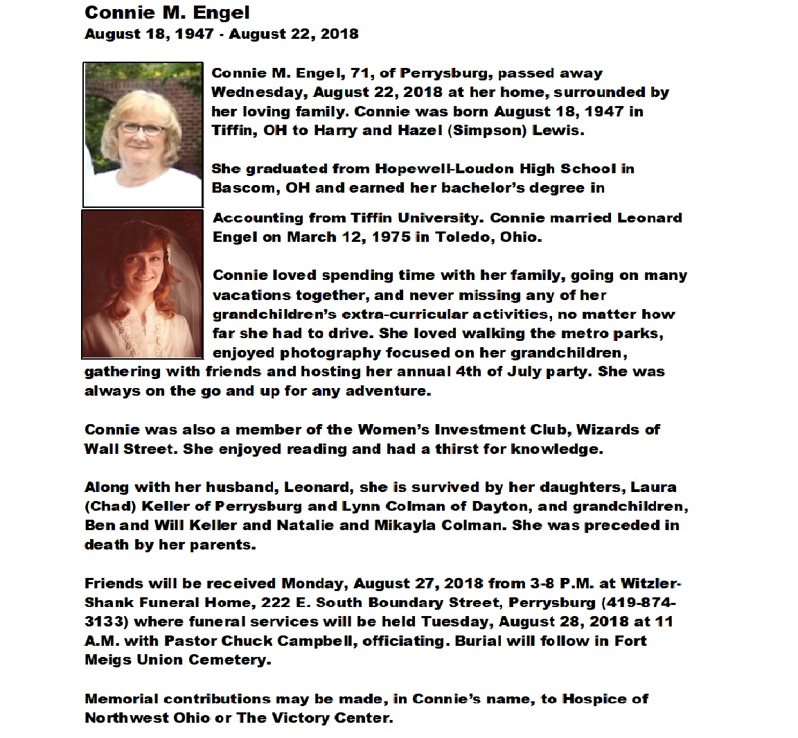 Engel, Connie - Obituary, Witzler Shank Funeral Home, Perrysburg, OH