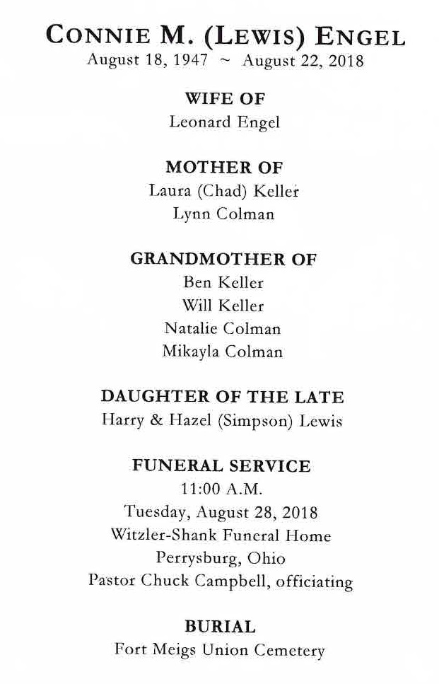Engel, Connie - Remembrance Card, Witzler Shank Funeral Home, Perrysburg, OH