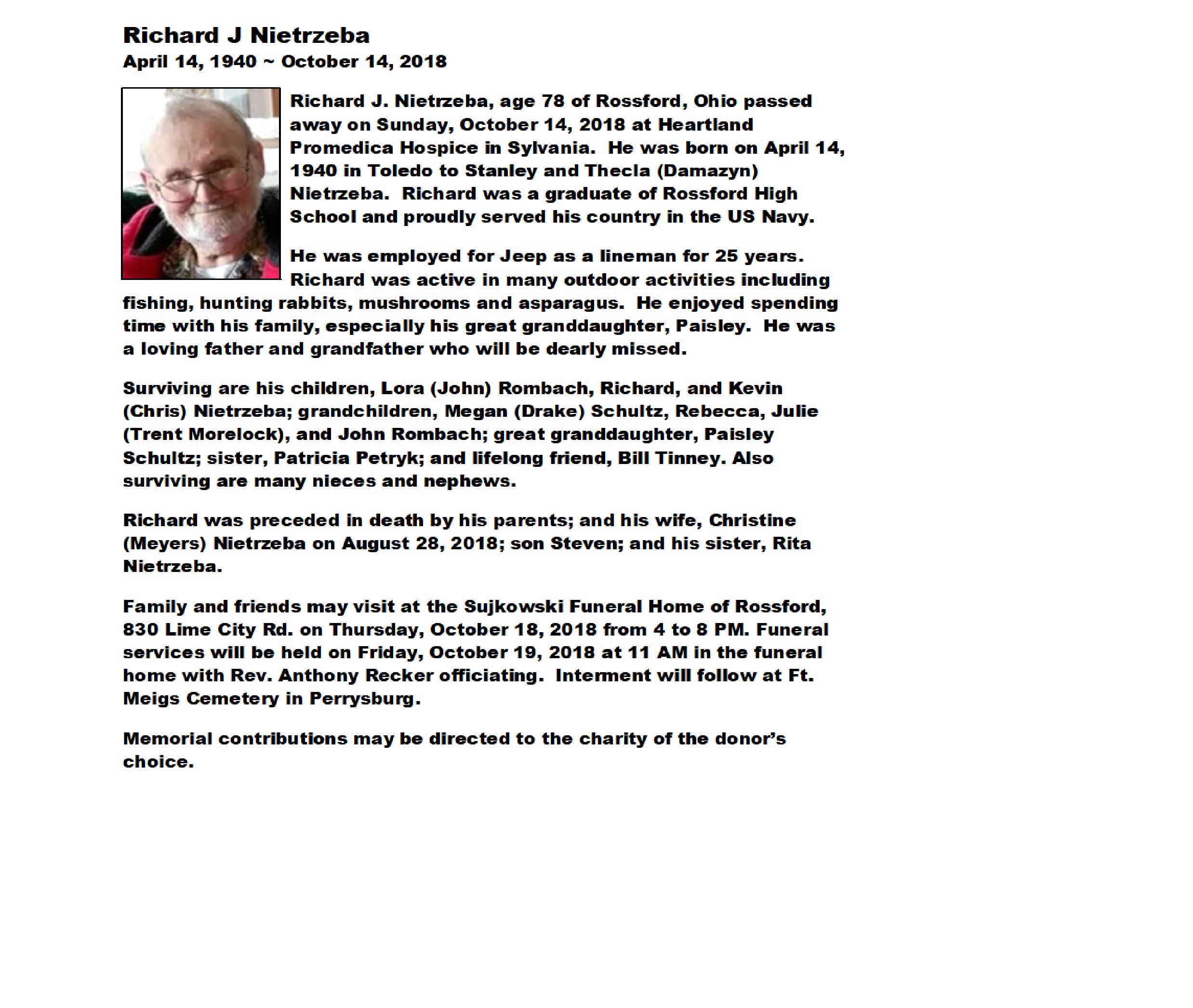 Nietrzeba, Richard, Sujkowski Funeral Home, Rossford, OH