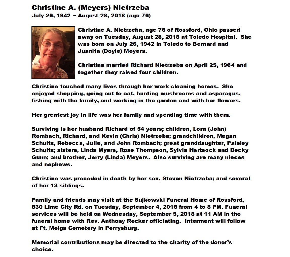Nietrzeba, Christine, Sujkowski Funeral Home, Rossford, OH
