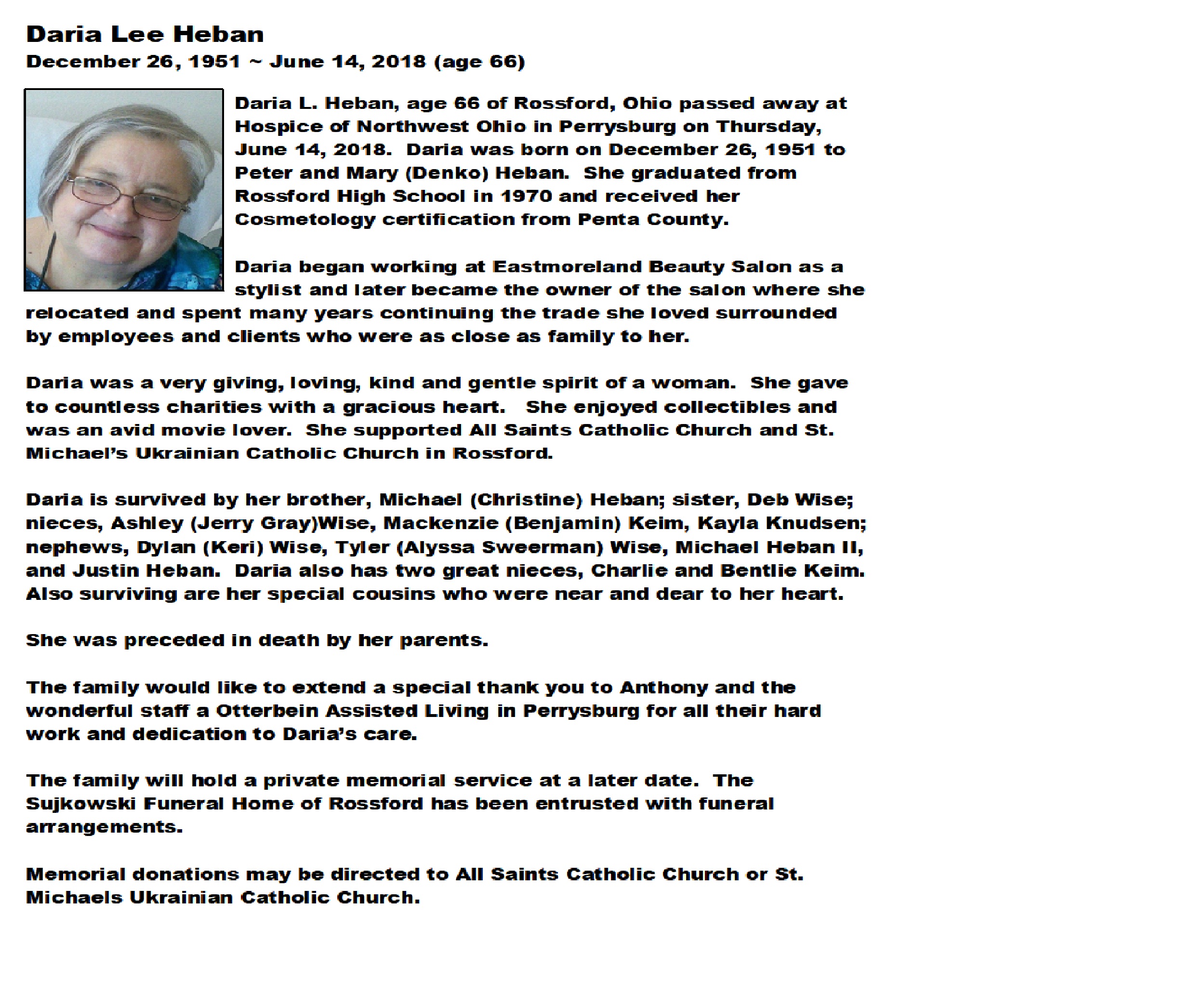 Heban, Daria, Sujkowski Funeral Home, Rossford, OH