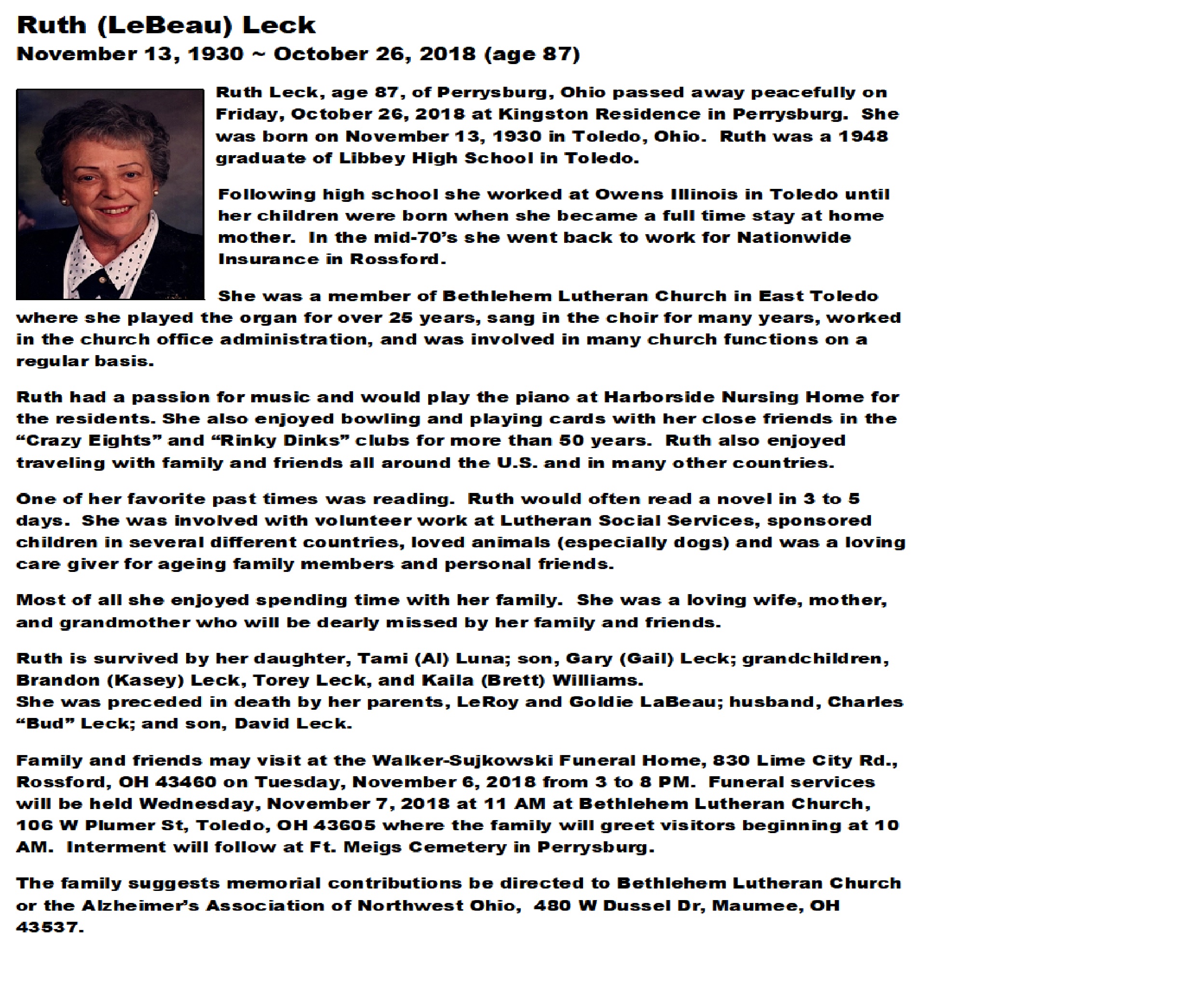 Leck, Ruth, Sujkowski-Walker Funeral Home, Rossford, OH