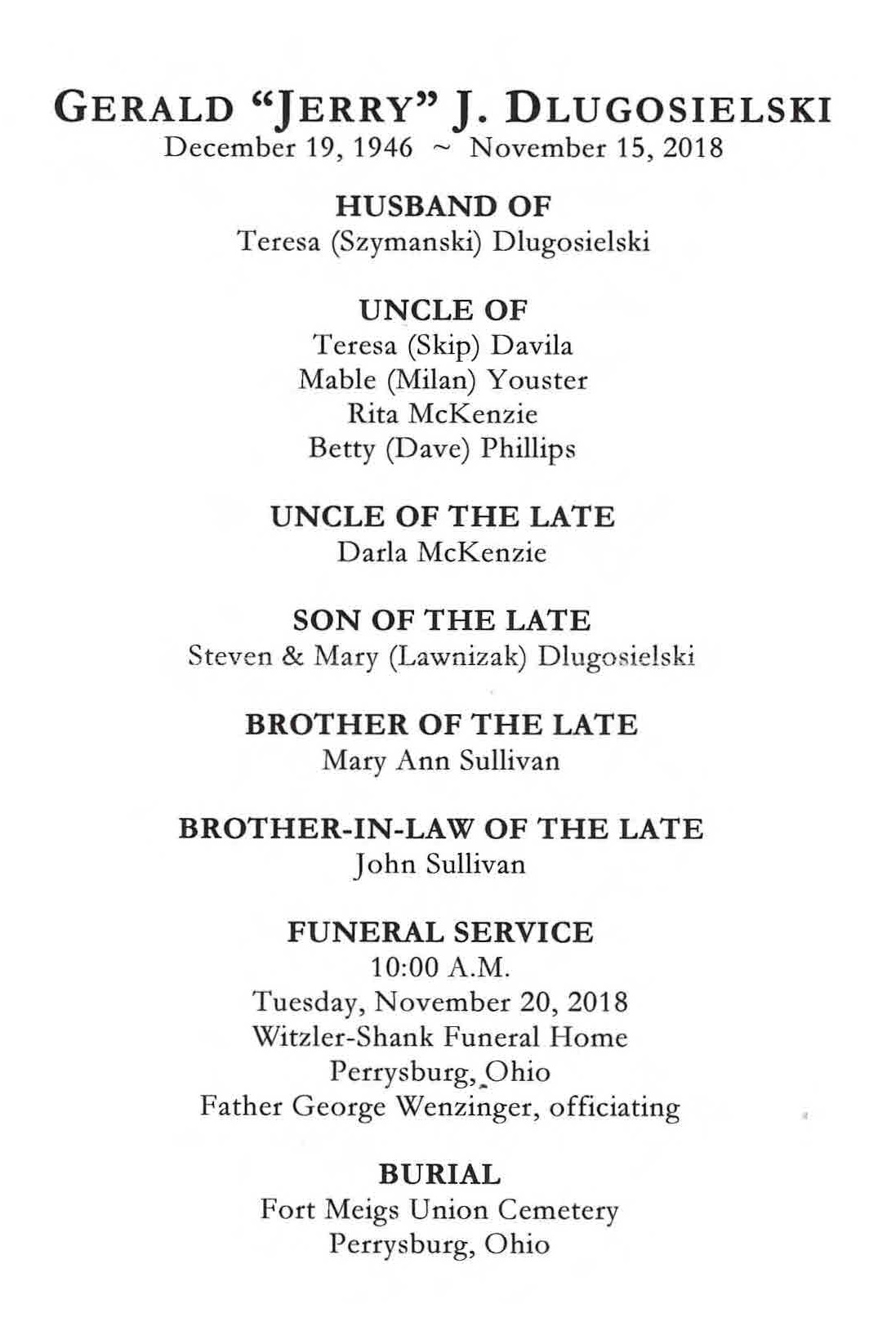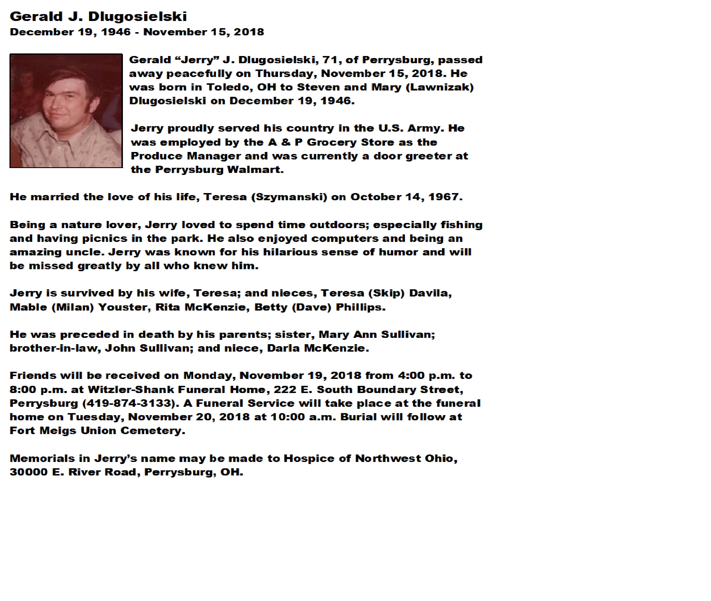 Dlugosielski, Gerald - Obituary, Witzler Shank Funeral Home, Perrysburg, OH