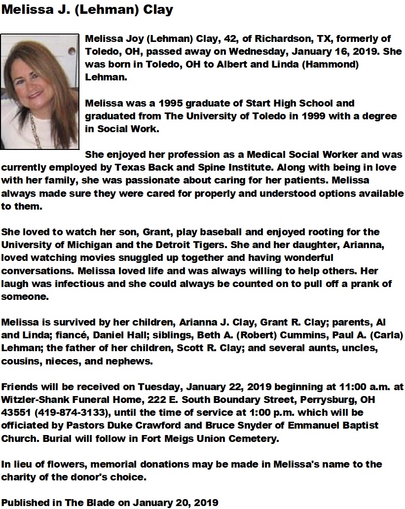 Clay, Melissa J - Obituary, Witzler Shank Funeral Home, Perrysburg, OH
