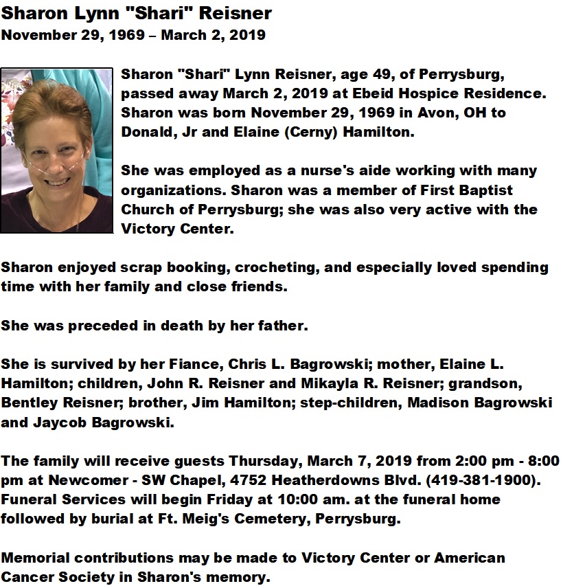 Reisner, Sharon - Obituary, Newcomer Funeral Home SW Chapel, Toledo, OH