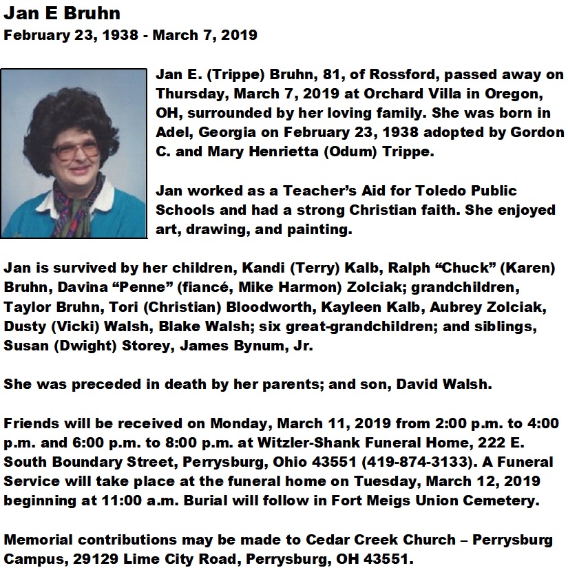 Bruhn, Jan - Obituary, Witzler Shank Funeral Home, Perrysburg, OH
