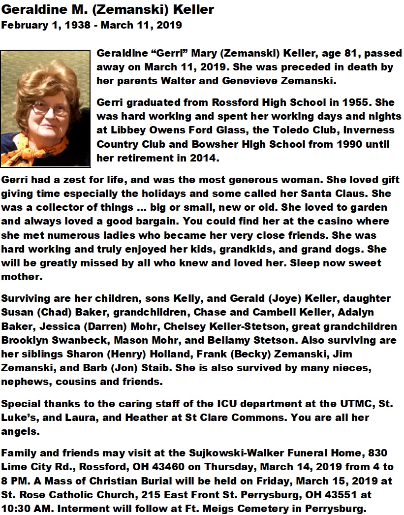 Keller, Geraldine - Obituary, Sujkowski Walker Funeral Home, Rossford, OH