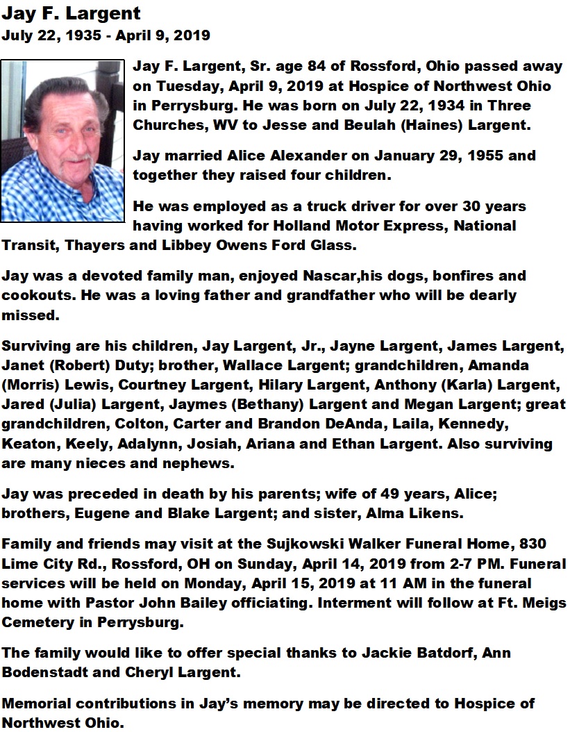Largent Sr, Jay - Obituary, Sujkowski-Walker Funeral Home, Rossford, OH