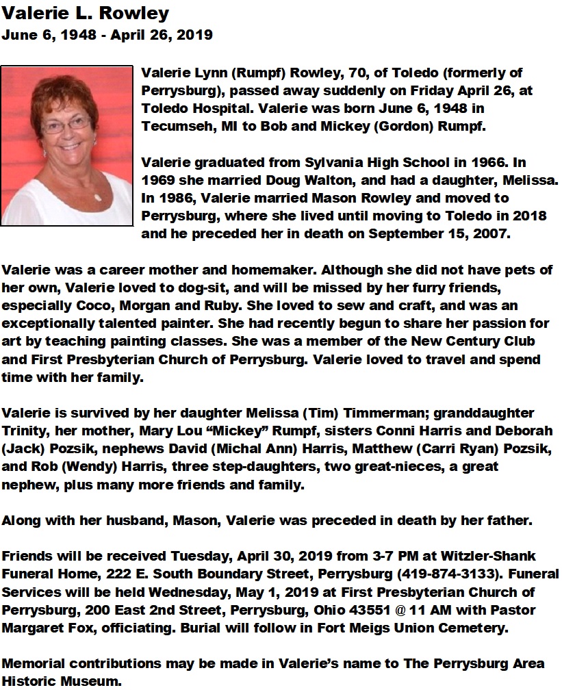 Rowley, Valerie - Obituary, Witzler Shank Funeral Home, Perrysburg, OH